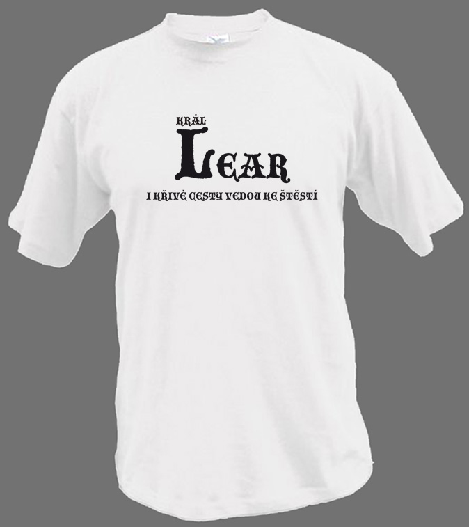 Bílé tričko s černým textem: "Král Lear – I křivé cesty vedou ke štěstí"